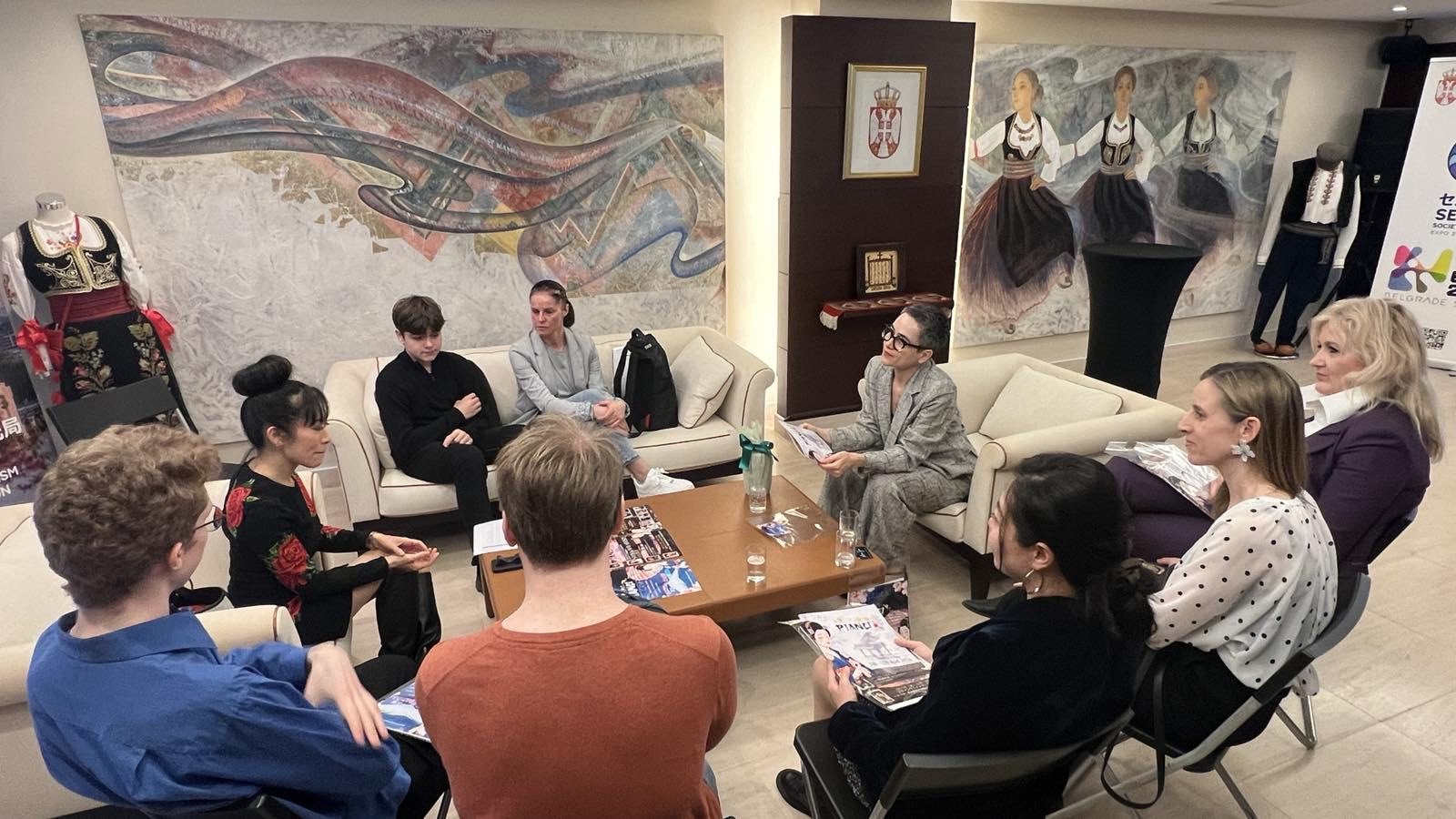 Посета Амбасади је била организована са циљем представљања пијанисте из Србије, Михајла Стојановића (14 година), као једног од награђених младих уметника на прошлогодишњем међународном пијанистичком такмичењу у Монтекатинију, Италија, који је овим поводом извео музичку композицију. Посети су се придружили други учесници кампа, односно страни студенти клавира и професори из Шведске и Сингапура.
